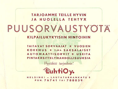 HistoriaLuhti Oy perustettiin vuonna 1934. Koko ajan olemme toimineet Helsingissä, ensin Harjukadulla Kalliossa, sen jälkeen Lautatarhankadulla Sörnäisissä ja 50-luvun loppupuolelta alkaen Linnanherrankujalla Vartioharjussa. Toimintamme runkona oli vuosikymmeniä puusorvaaminen ja vilkkaimpaan aikaan oli toiminnassa useita automaattisorveja. Päätuotteitamme olivat esimerkiksi puiset vetimet, sorvatut kaiteet, huonekalujen puuosat ja tietysti Mekano-lelut, joita valmistimme useita vuosia. Koko sodan jälkeinen aika oli puusorvaamisen kulta-aikaa, koska puuosia käytettiin lähes kaikessa teollisesti valmistetuissa tuotteissa. Monet Kalliossa ja Sörnäisissä 40- ja 50 luvuilla lapsuutensa viettäneet ovat kaiholla muistelleet Luhti Oy:n takapihalta Lautatarhankadulta löytyneitä aarteita – erikokoisia puupalloja ja mitä eriskummallisimpia sorvattuja puupalikoita. 70-luvulla muovi syrjäytti puun monessa asiassa teollisuudessa ja tämä pakotti myös meidät keskittymään sorvauksen sijaan yhä enemmän perinteiseen tilauspuusepän toimintaa. Tänään toimintamme on keskittynyt kokonaan jalopuusisustamiseen, kuten portaisiin, ruokapöytiin, parketteihin ja työtasoihin. Valmistamme tuotteita useista kymmenistä eri puulajeista. Vuosikymmenien kokemus jalopuiden käyttäytymisestä ja ominaisuuksista on tehnyt Luhti Oy:stä alalleen merkittävän osaajan ja edelläkävijän pääkaupunkiseudulle. |